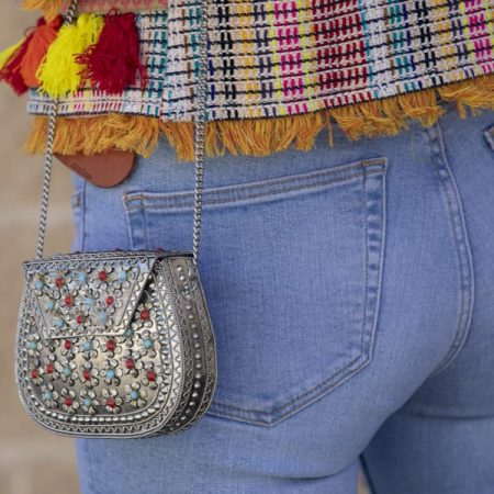 Bolso latón con incrustaciones de flores en color turquesa y coral. También disponible en color esmeralda y coral.
